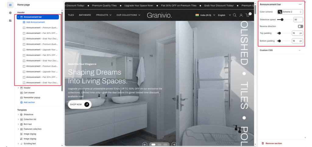 The Announcement Bar section allows you to display rotating or static messages at the top of your store. This is useful for sharing important announcements, promotions, shipping updates, or seasonal messages.