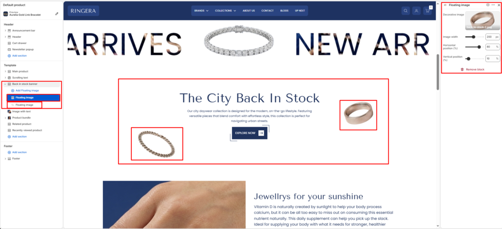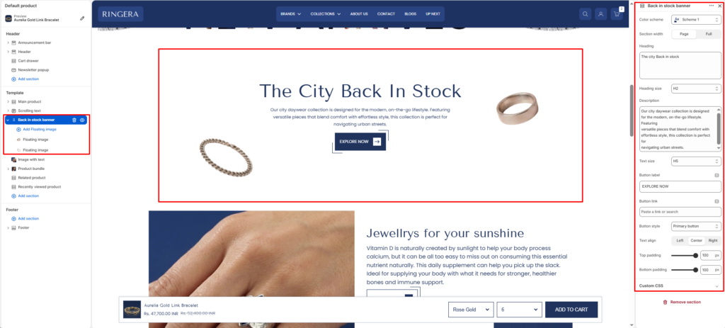 The Back in Stock Banner section is designed to highlight restocked or featured products with a strong visual presentation. It allows you to combine text content, call-to-action, and decorative floating images to attract customer attention.