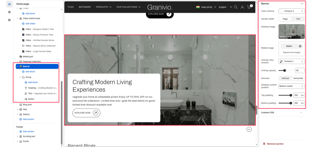 The Banner section is a visually impactful area designed to display a large background image (or video) with optional text overlay content. It’s commonly used on landing pages such as About Us, Collections, or Home, to introduce the page with strong visuals and key messaging.