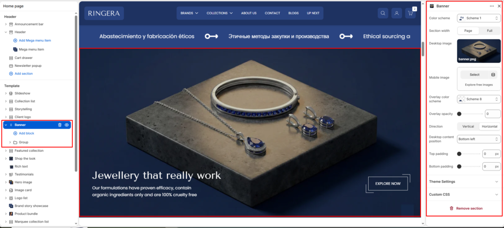 The Banner section is a visually impactful area designed to display a large background image (or video) with optional text overlay content. It’s commonly used on landing pages such as About Us, Collections, or Home, to introduce the page with strong visuals and key messaging.