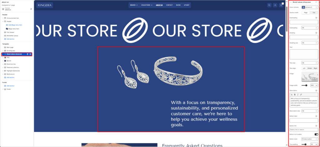 The Brand Values Showcase section presents a full-width, image-and-text composition designed to communicate your brand story, values, or a key message. It combines a featured product or lifestyle image on one side with a structured text block — including a subheading, heading, body description, and a call-to-action button — on the other. All text elements have independently configurable sizes and alignment.