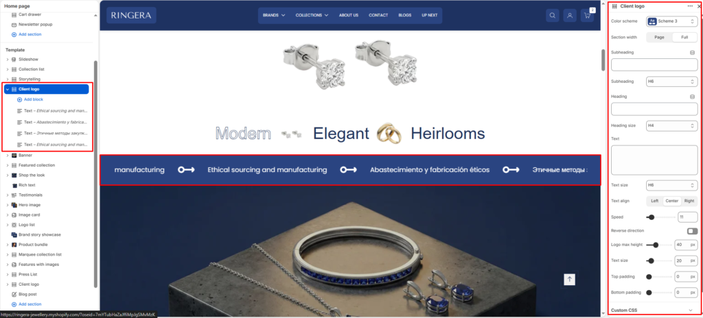 The Client Logo section allows you to display a horizontally scrolling carousel of brand logos or promotional messages. Ideal for showcasing partner brands, featured collaborators, or promotional texts, this section enhances brand credibility and visual interest.