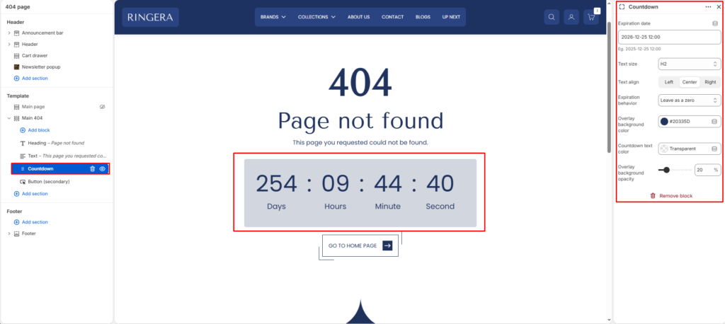 The Countdown Timer block displays a live, ticking clock counting down to a specific date and time. It is highly effective for limited-time offers, flash sales, and product launches.