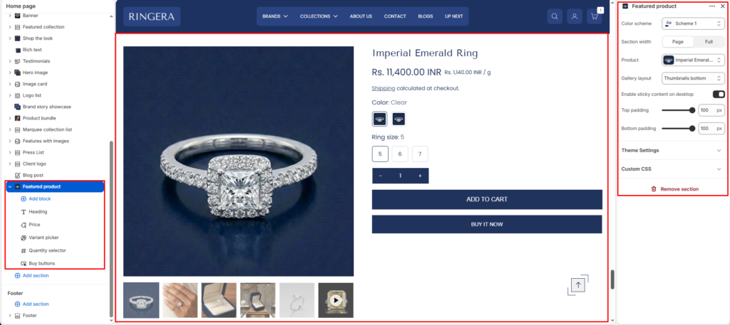 The Featured Product section lets you spotlight a single product anywhere on your home page. It renders a full product experience — image gallery, title, price, variant pickers, quantity selector, and purchase buttons — without leaving the page. Content is assembled from customizable blocks so you can control exactly which product details appear and in what order.