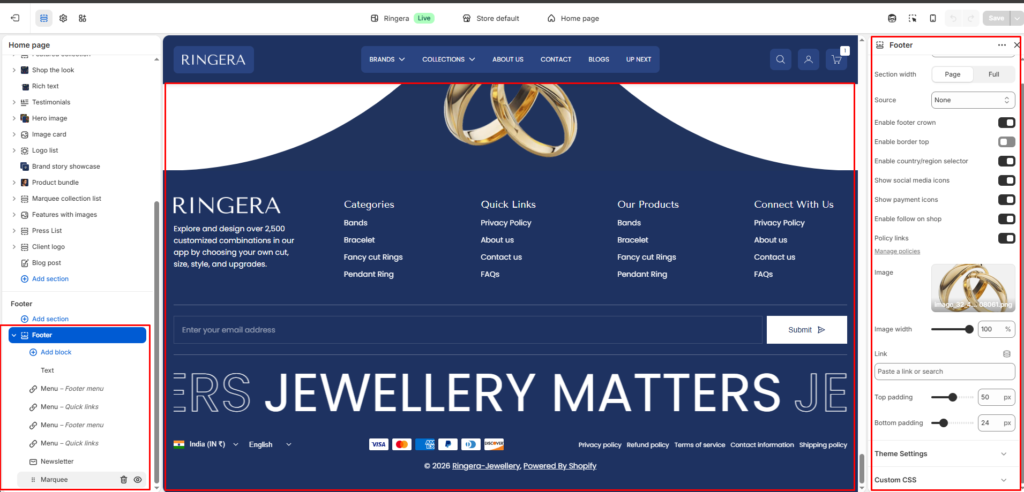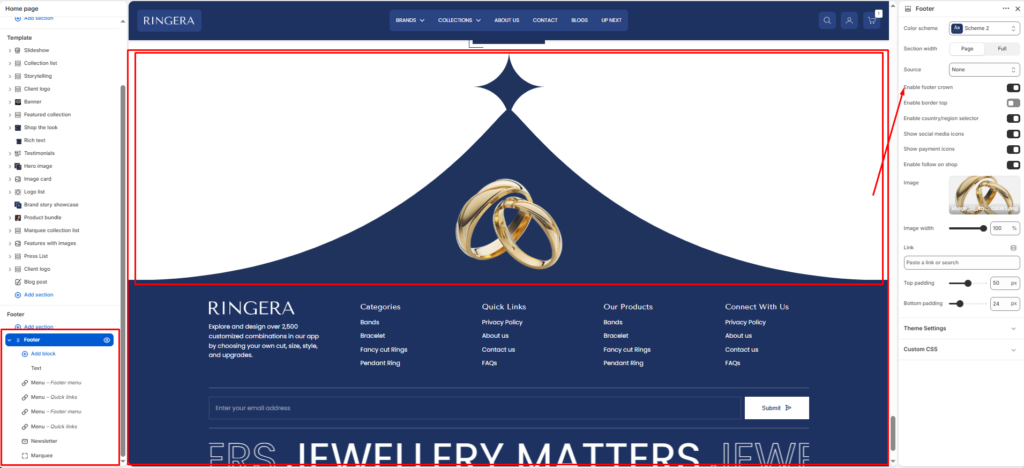 The Footer section appears at the bottom of every page and is fully customizable from the Shopify theme editor. It supports a background image, color scheme, newsletter subscription, navigation menus, social icons, payment badges, and a logo image.