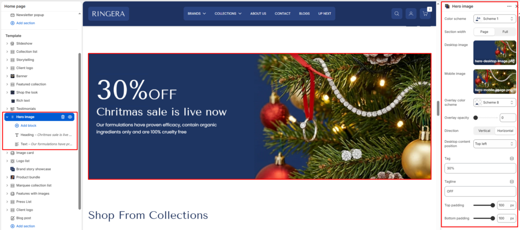The hero image section displays a large visual banner with optional text content and app/theme blocks layered on top. Use it for promotions, announcements, or key landing messages.