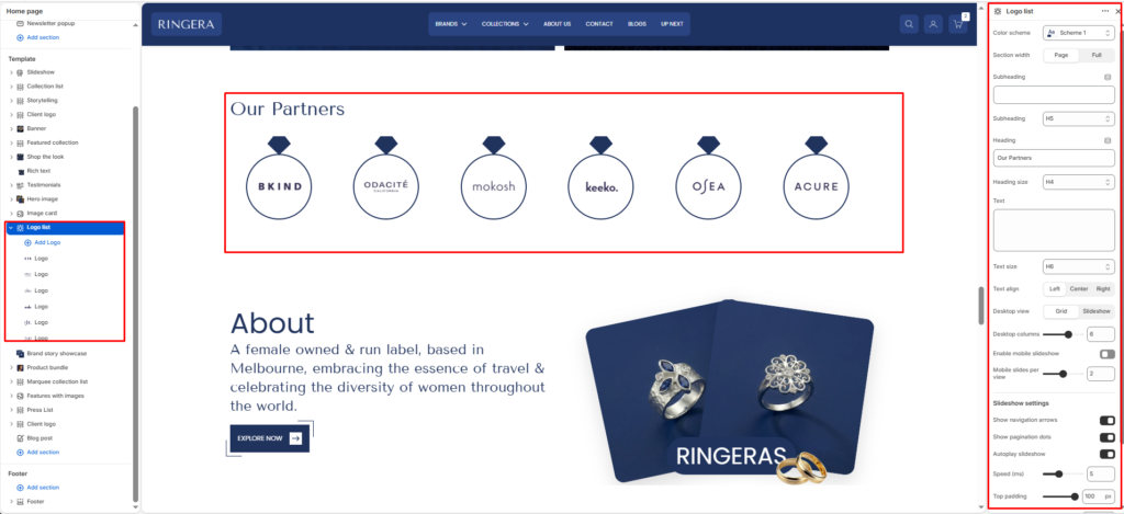 The Logo list section shows a row of partner or brand marks with optional titles and short captions. You can present them as a grid or as a slideshow, and you can keep desktop in grid while using a carousel on smaller screens.