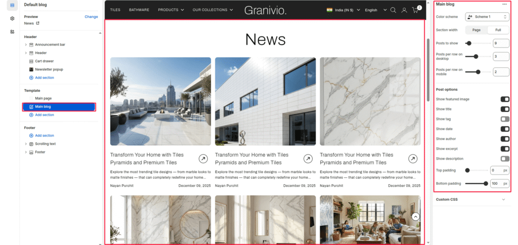 The Main Blog section displays your store’s blog posts in a customizable grid layout. It allows you to showcase featured images, titles, excerpts, author names, and post dates. The layout is responsive and supports pagination for browsing multiple posts.