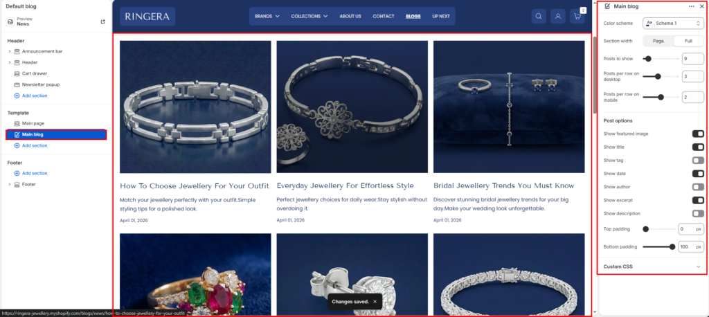 The Main Blog section displays your store’s blog posts in a customizable grid layout. It allows you to showcase featured images, titles, excerpts, author names, and post dates. The layout is responsive and supports pagination for browsing multiple posts.