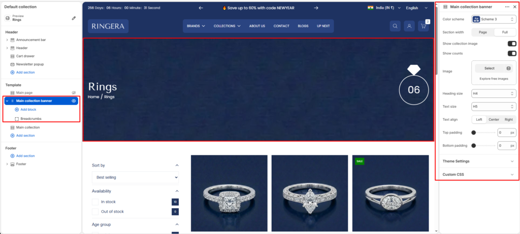 The Main Collection Banner section displays the banner area at the top of a collection page. It helps highlight the collection name, image, and breadcrumbs, giving customers clear context about what collection they are viewing.
