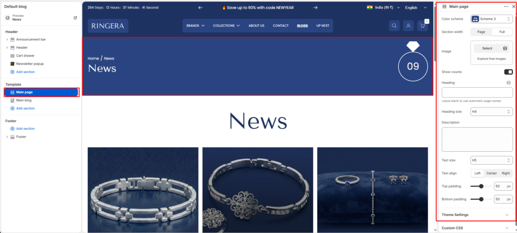 The Main page section is a page header or hero strip for templates such as the homepage, collections, blogs, articles, standard pages, cart, and search. It can show breadcrumbs (when breadcrumbs are enabled in theme settings), a prominent title, optional description, an optional background image, and—on supported templates—a numeric badge that reflects list length or cart quantity.