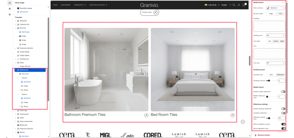 Each column supports an image, title, text, and optional link, giving merchants flexible control over how content is presented.