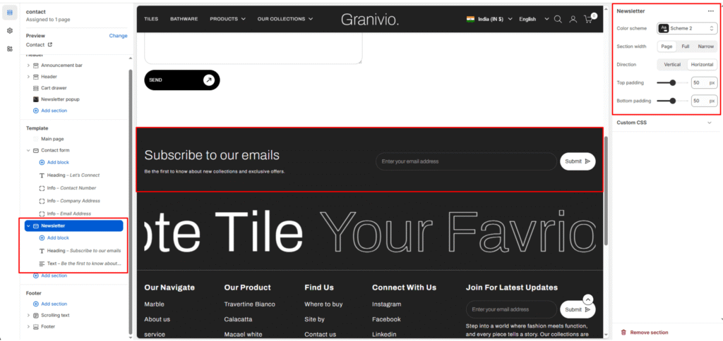 The Newsletter section allows customers to subscribe to your mailing list, enabling you to build your audience and keep them informed about new launches, promotions, and exclusive updates. It’s an essential part of the store’s engagement and retention strategy.