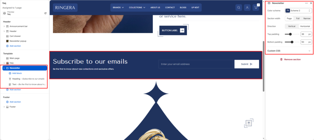 The Newsletter section allows customers to subscribe to your mailing list, enabling you to build your audience and keep them informed about new launches, promotions, and exclusive updates. It’s an essential part of the store’s engagement and retention strategy.
