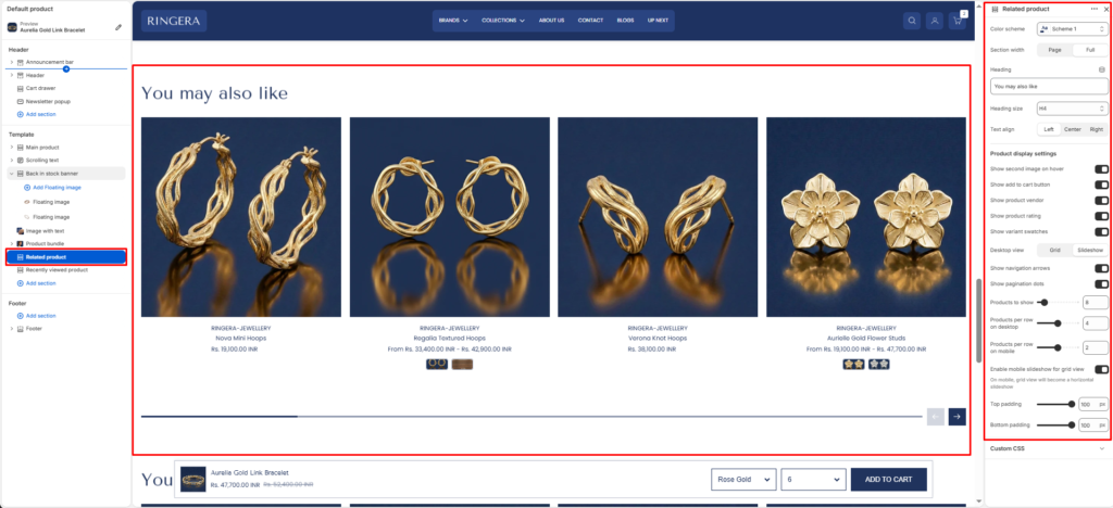 The Related Products section is designed to display a collection of suggested or complementary products on the product page. It helps increase cross-selling opportunities and improves customer browsing experience by showcasing similar or recommended items. The layout supports both grid and slider views, allowing full customization for desktop and mobile displays.
