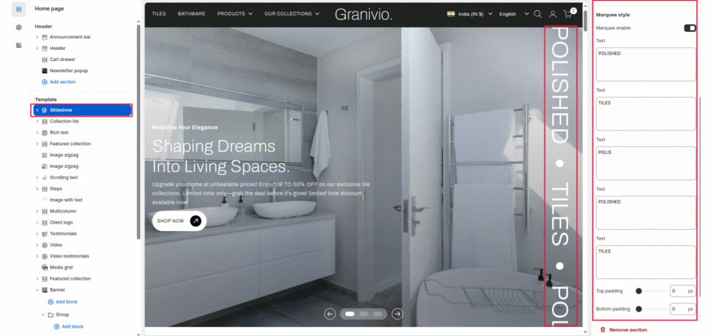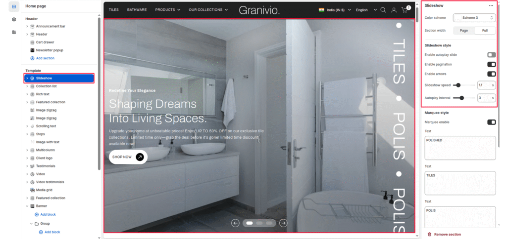 The Slideshow section displays large visual slides with images, text overlays, and call-to-action buttons. It is commonly used as a hero section on the homepage to highlight promotions or collections.