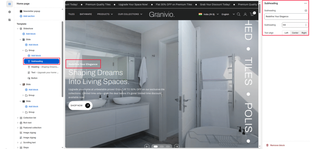 The subheading block allows you to add a prominent heading or main message to your slide. It’s typically used to highlight campaign names, product launches, or brand taglines displayed over the slideshow image.