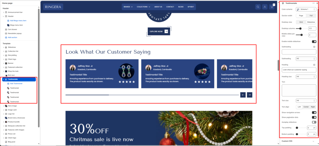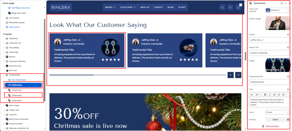 The Testimonials section is a powerful social proof tool that allows you to showcase customer reviews, photos, and ratings in a highly customizable slider or grid layout. It builds trust by pairing authentic customer feedback with the specific products they purchased.