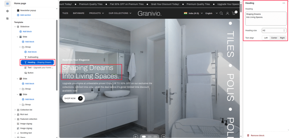 The heading block allows you to add a prominent heading or main message to your slide. It’s typically used to highlight campaign names, product launches, or brand taglines displayed over the slideshow image.
